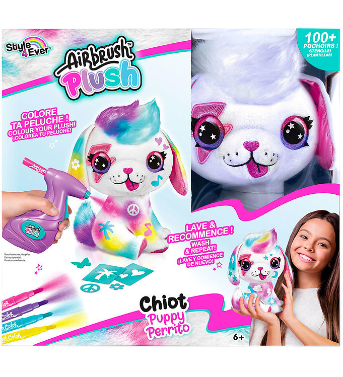 Slip kreativiteten løs! Med Airbrush Plush Hunden kan barnet selv designe og farvelægge sin bamse ved hjælp af de medfølgende airbrush-farver og skabeloner. Bamsen kan vaskes, så man kan starte forfra igen og igen. Lige nu på et godt tilbud!